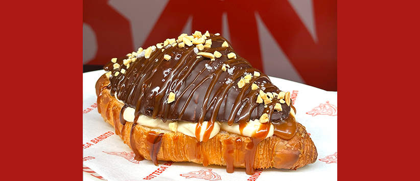 Fresh croissant filled with peanut butter diplomat cream and caramel. Dipped in dark chocolate and finished with caramel, peanuts and a sprinkle ...