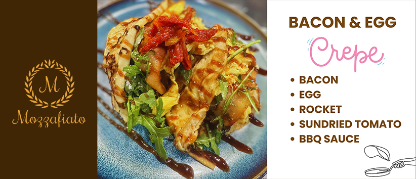 Start the day right with a breakfast crepe from Mozzafiato. Bacon, Egg, Rocket, Sundried Tomato and BBQ Sauce.